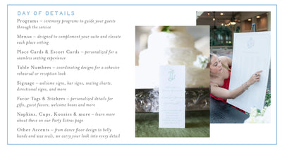 Your wedding design doesn’t stop with the invitation — it carries through every moment of your celebration. From programs and menus to signage, escort cards, and more, we create day-of details that coordinate seamlessly with your suite. Thoughtfully designed and artfully crafted, these finishing touches bring cohesion and refinement to the entire experience, ensuring your wedding feels timeless from first impression to final farewell.