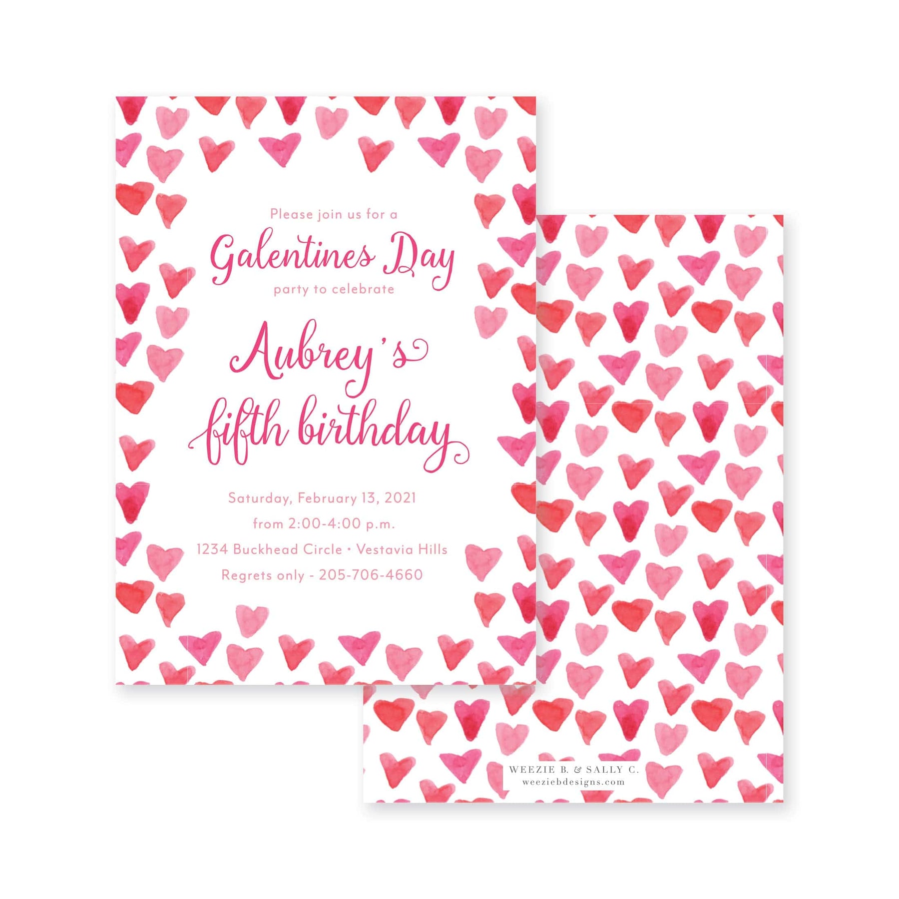 The perfect Valentine invitation design to celebrate your sweet valentine's birthday! If you are just having a Galentines Party, with no birthday attached, just mention that in our notes section of our form. With our watercolor hearts in pinks and red, this invitation is fun and festive!