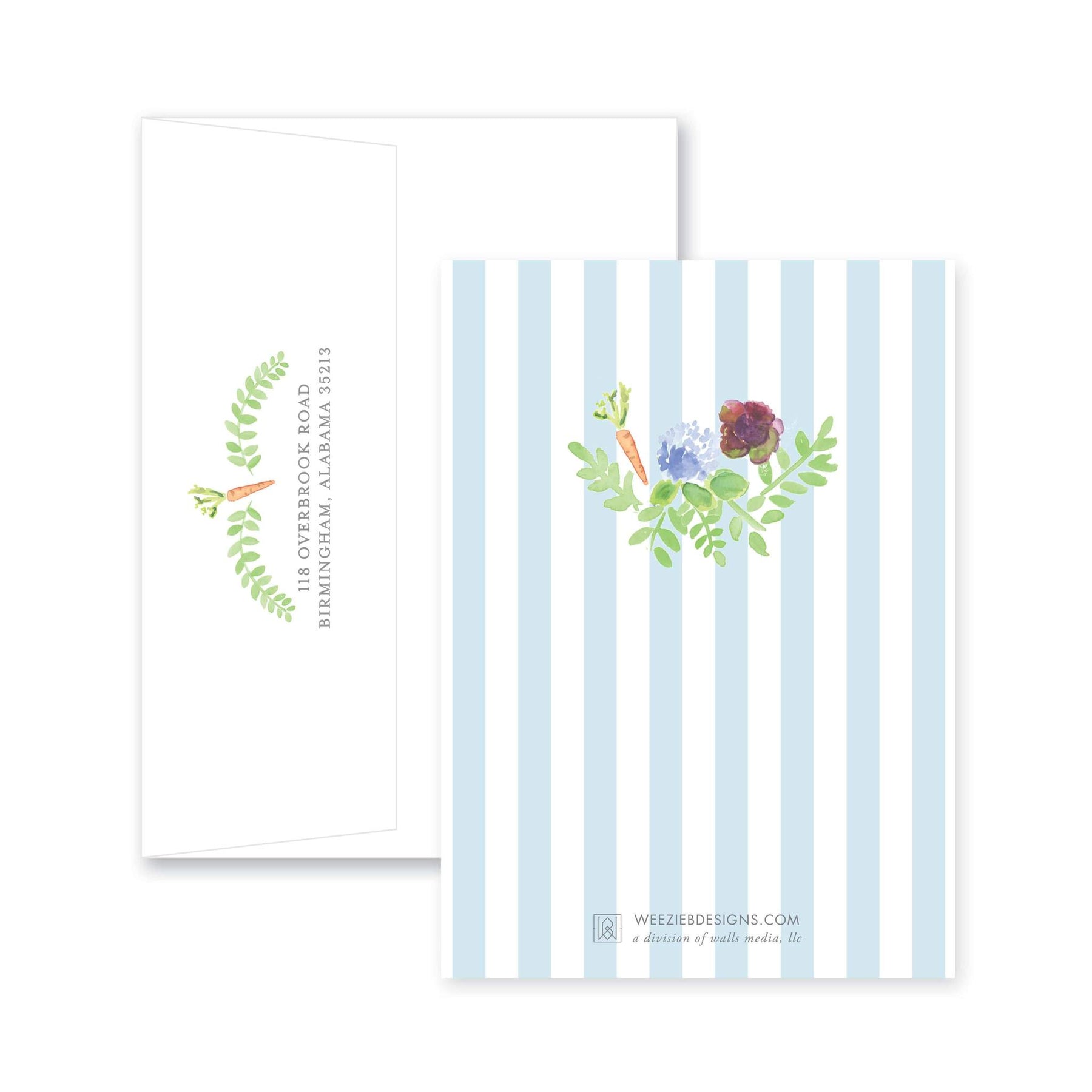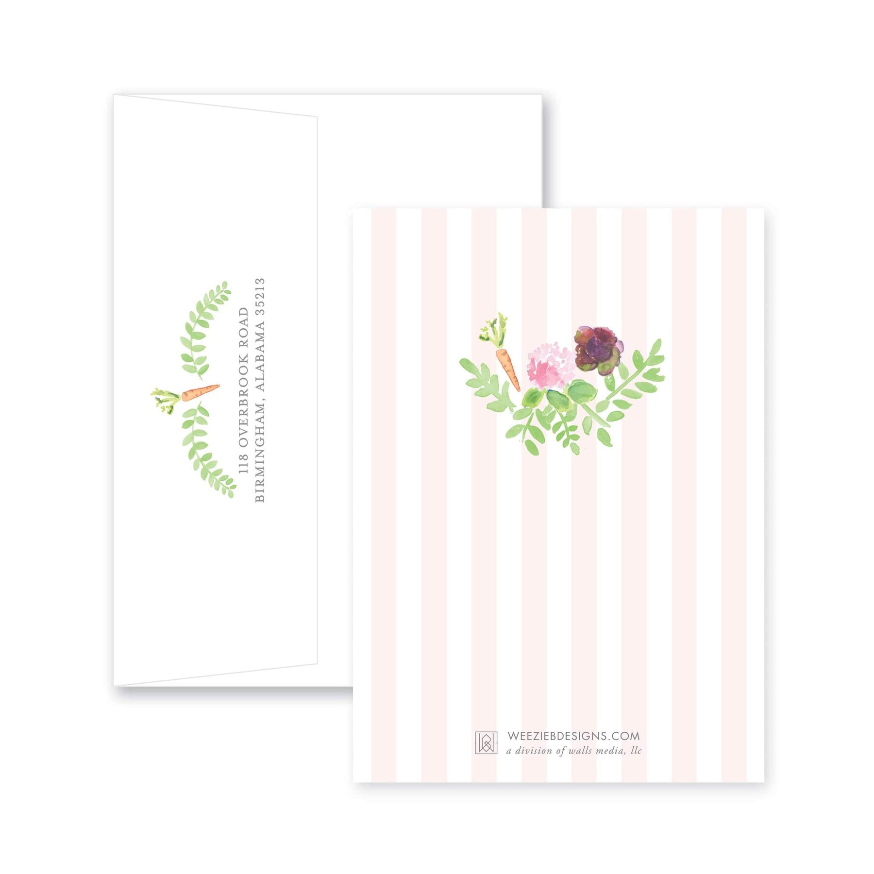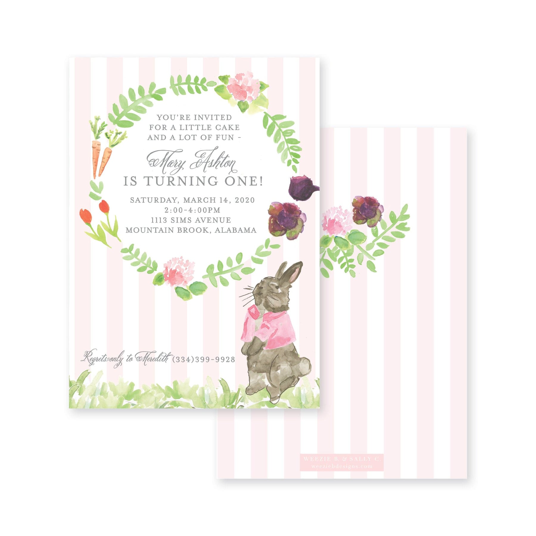 Our Watercolor Garden Bunny Rabbit Birthday Invitation is a little nod to a favorite nursery story. This sweet invitation can also be used for other birthdays- we'll do our best to have a rhyme go with any age! In pink or blue, these flowers and vegetables with a standing bunny is a sweet invitation! If you have twins, we can double the bunnies!